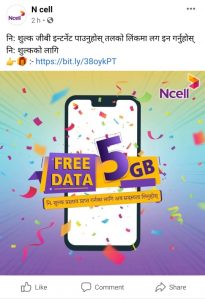 फिशिङ अन्तर्गत एनसेलको नक्कली पेजबाट ५ जीबी फ्री डेटा र नेपाल टेलिकमको पेजबाट ३ जीबी डेटाकोे लोभ देखाउँदै बिट्ली लिंक दिइएको छ । सोझा प्रयोगकर्ता फ्री इन्टरनेट पाउने अपेक्षामा सो लिंकमा क्लिक गरे साइबर अपराधीको हमलामा पर्नेछन् ।