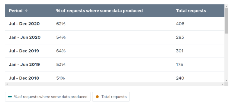 जब कि वर्षको सुरुवाती छ महिनामा २८३ पटकको अनुरोधमा ३६२ जना प्रयोगकर्ताको जानकारी मागिएको थियो । पछिल्लो पटकको अनुरोधमा ३८० वटा कानूनी प्रक्रियास“ग र २६ वटा आपतकालीन खुलासा सँग सम्बन्धित रहेका थिए ।