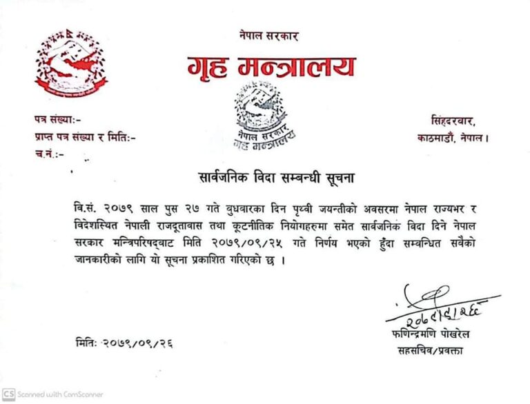मंगलबार बसेको मन्त्रिपरिषद्को बैठकले पुस २७ गते सार्वजनिक विदा दिने निर्णय गरेको थियो। गृहमन्त्रालयले बैठकमा विदाको लागि प्रस्ताव लगेको थियो।